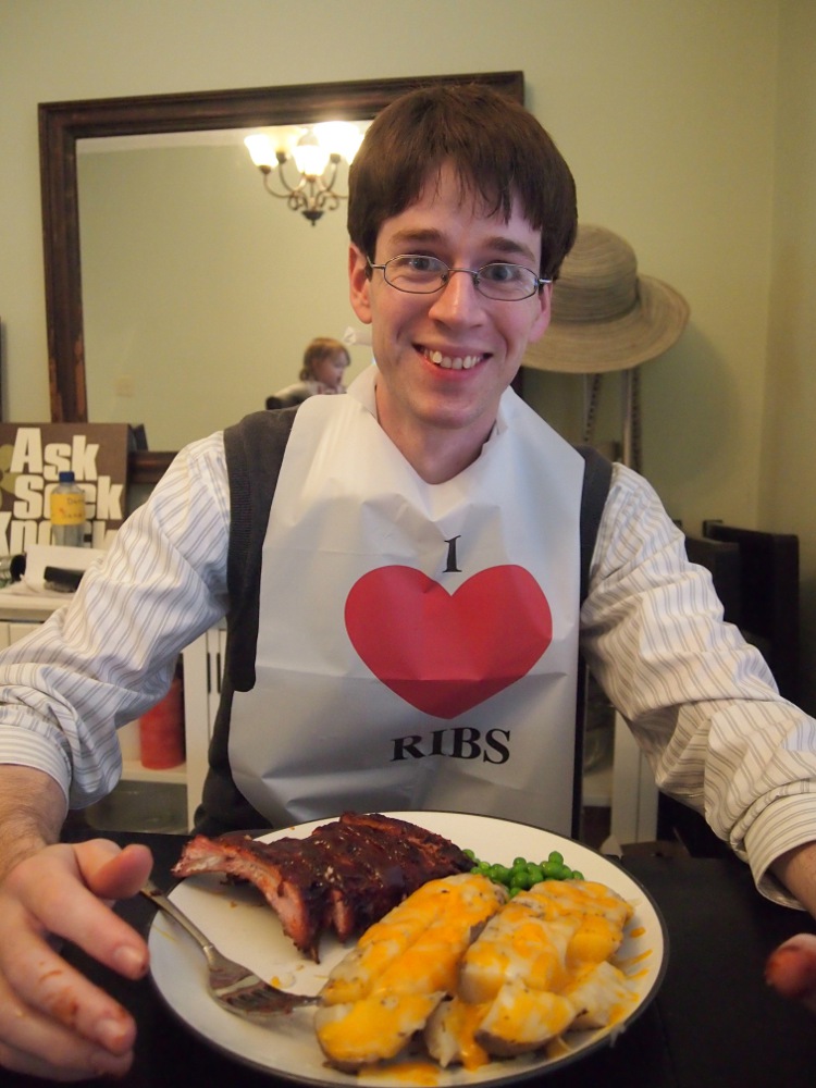 Let me tell you just how easy it was to serve one of the best “home cooked” meals we have had in ages. First, the ribs showed up on my front door (FedEx let me know what day to expect them so that I could plan accordingly). They were still frozen as they had been packed in dry ice. They were sealed tight, fully cooked, had sauce already on them, and just needed to be thawed (it only took a few hours), cut out of their packaging, put in aluminum foil, and heated up for about 40 minutes. Since my family likes “wet” barbecue, I added a little bit of extra sauce for the last 10 minutes that it was in the oven. Then I pulled them out and let them rest for 10 minutes. I had some baked potatoes that had been cooking in the crockpot (here’s my crock pot potato recipe!). And then I heated up some peas in the microwave. Voila! A restaurant-quality meal on a weeknight. Awesome!
