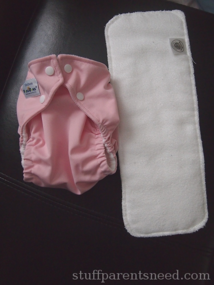Here’s a pic of the diaper and the insert. The insert is nice and thick (and absorbent!), yet the diaper is actually quite trim! I would actually like to purchase some additional FuzziBunz inserts because I’m so fond of them.