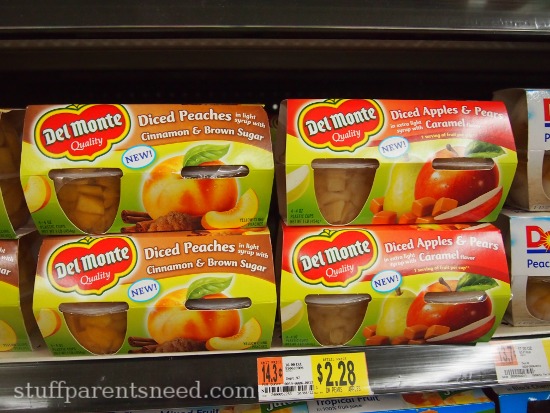 It is my job to make sure that every option in the bin is a healthy choice. Del Monte Fruit Cups have been introduced to the snack bin, and they get snapped up VERY quickly, I have to say. I recently went to Walmart to restock our supply of fruit cups, and while I was there I picked up two new flavors, Diced Apples & Pears with Caramel Flavor and Diced Pears with Vanilla & Spice. Don’t those sound simply scrumptious for the fall and winter seasons? I spotted them on the shelves at my local Walmart a few days ago. If you want to come along with me on my entire shopping trip, click here to see what I saw while grocery shopping at 6 am!