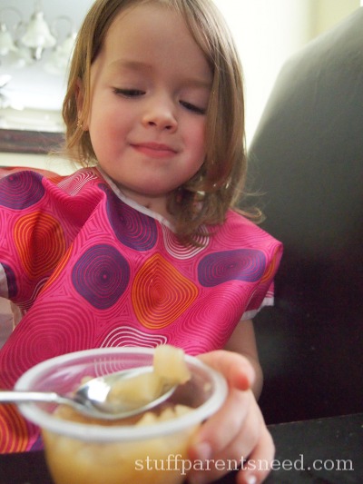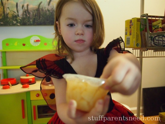 While she doesn’t normally wear bibs, I thought it might be wise to put on a smock over her costume since these fruit cups do contain a light syrup and the odds of it landing on her costume were good. I sat with her while she ate, and we talked about what our plans were for the afternoon. We decided that a walk down to the park might be fun. While we chatted, she made a point of telling me that she liked her snack because it was just the right size for her. I think she’s right!