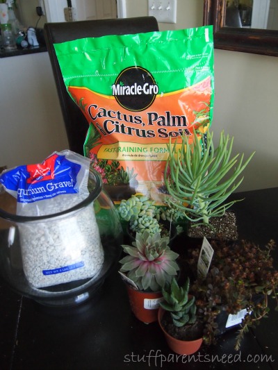 We headed to Walmart in the hopes of picking up everything. But our Walmart didn’t carry succulents, so we did have to make a separate trip to a nursery to find these. At Walmart we went to the pet section to get a pretty and simple fish bowl (very affordable at around $8) and some rocks designed for fish tanks. We also picked up some cactus soil