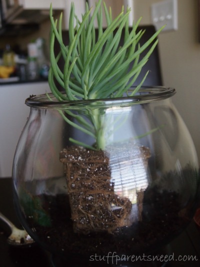 Ok, so the first step in how to make a terrarium is to put some dirt in the base of your fish bowl. This is a great task to give to your child.